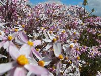 This delightful and showy everlasting daisy grows in a wide range of areas in Western Australia, and is one of the contributors to the tourist attracting wildflower display there every year after good autumn rains. An annual plant, it has furry leaves and stems and clusters of flowers with yellow centres surrounded by pink papery bracts in late winter, spring through to summer (depending on the time that seed is sown or when rain events trigger germination). Frost tender.